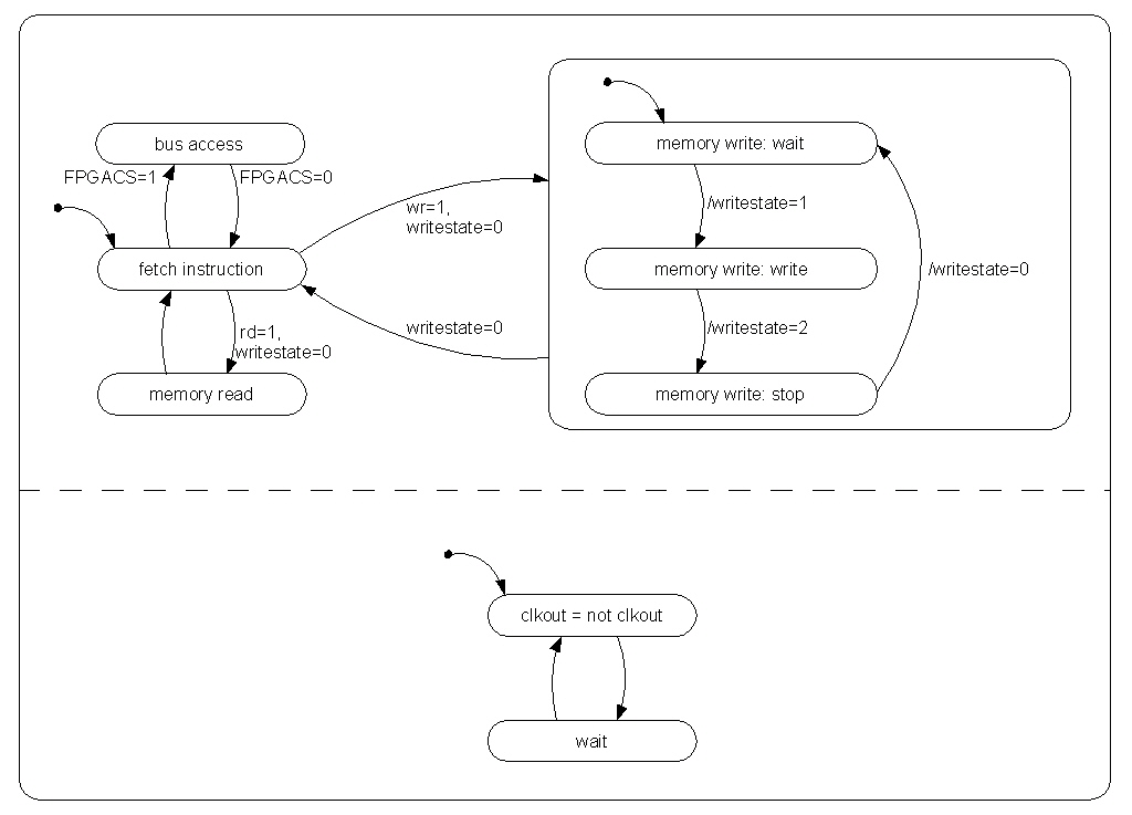 The statechart in figure 4.14 shows the functionality of the Bus/Memory Interface Unit: In concurrent processes data from memory or bus is processed as well as clock division done so that memory or stack access can be executed in one pipeline clock cycle.