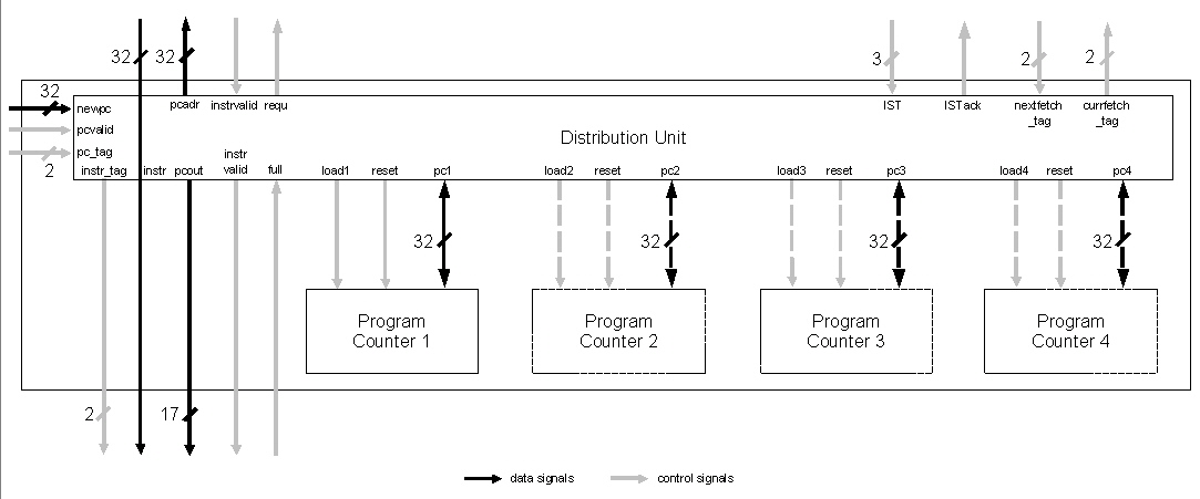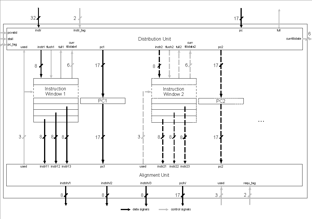 A problem is the processing of the program counter belonging to the first entry of this fifo buffer. It has to be passed to the following execution stage because branch target address calculation is done there. It cannot be passed directly, because of the split-up of 32 Bit fetch data into 8 Bit fifo data. A new PC has to be computed out of fill-level information from the instruction buffer and the PC for the next memory data.