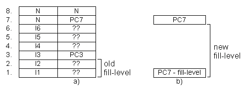 In fig. 4.5 a) one box symbolizes one entry in the buffer. It can be filled by an instruction (I1..n) or not used (N). The program counter buffer on the right holds the belonging program counter (PC1..n) or is not filled. Only every four bytes comes a new program counter, all others are not known (??).