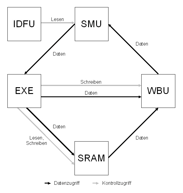 Die verschiedenen Befehle benutzen diese Einheiten auf unterschiedliche Weisen: So gibt es Befehle, die ausschließlich mit Werten vom Stack arbeiten, andere wiederum laden beispielsweise Werte aus dem Speicher auf den Stack. Die Signale für diese Aktionen werden im wesentlichen in der Ausführungseinheit generiert. Eine Ausnahme bildet der lesende Zugriff auf den Stapelspeicher: Dieser wird durch die Dekodierstufe durch Anlegen aller benötigten Signale vorbereitet, damit die EXE nicht auch noch durch Warten auf Operanden vom Stack gebremst wird. Sie ist ohnehin schon die langsamste Stufe in der Pipeline, so daß weitere Zeitverluste in dieser Stufe aus Gründen des pipeline balancing vermieden werden müssen.