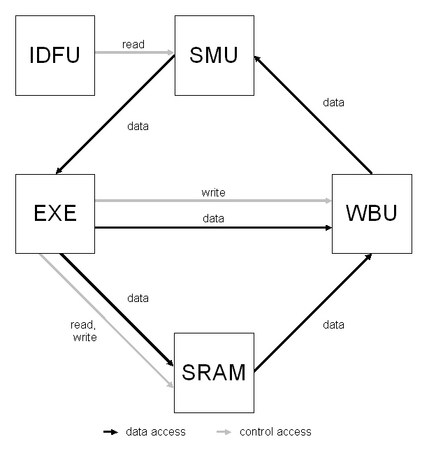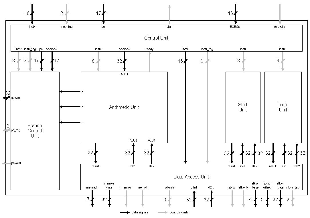 Different instructions use those internal units in different ways: Some only work on stack, others load data from external memory and store it on top of stack. The controlling signals are generated in the execution unit. As an exception to this rule read from stack is initialized by the decode stage.