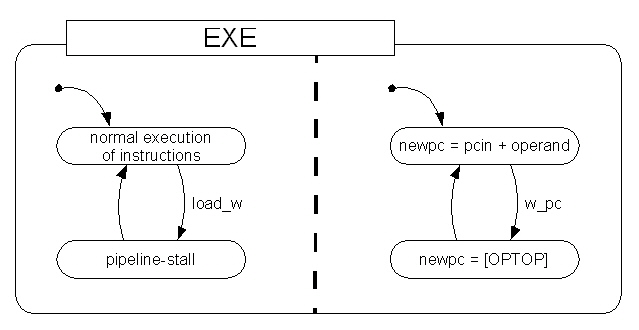 The statechart in figure 4.17 shows two concurrent processes. In parallel to the normal execution of instruction (which can be interrupted by a pipeline stall) a new program counter can be computed if necessary.