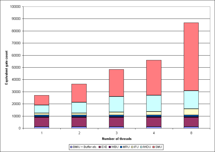 Eine sehr einfache und wenig optimierte Beschreibung der Mehrfädigkeit wurde für die Befehlsholestufe, die Puffereinheit mit Dekodierstufe und die Stapelspeichereinheit verwendet, um die Veränderungen im Ressourcenverbrauch abschätzen zu können. Danach ergeben sich die in Tabelle 6.3 enthaltenen durchschnittlichen Differenzwerte für diese drei Einheiten pro Kontrollfaden. Darin eingeschlossen sind auch die Kosten für die Verwaltung, also die zusätzlichen Kennungsbits.